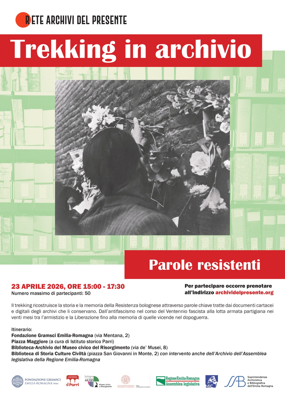 Il trekking ricostruisce la storia e la memoria della Resistenza bolognese attraverso parole chiave tratte dai documenti cartacei e digitali degli archivi che li conservano. Dall’antifascismo nel corso del Ventennio fascista alla lotta armata partigiana nei venti mesi tra l’armistizio e la Liberazione fino alla memoria di quelle vicende nel dopoguerra.